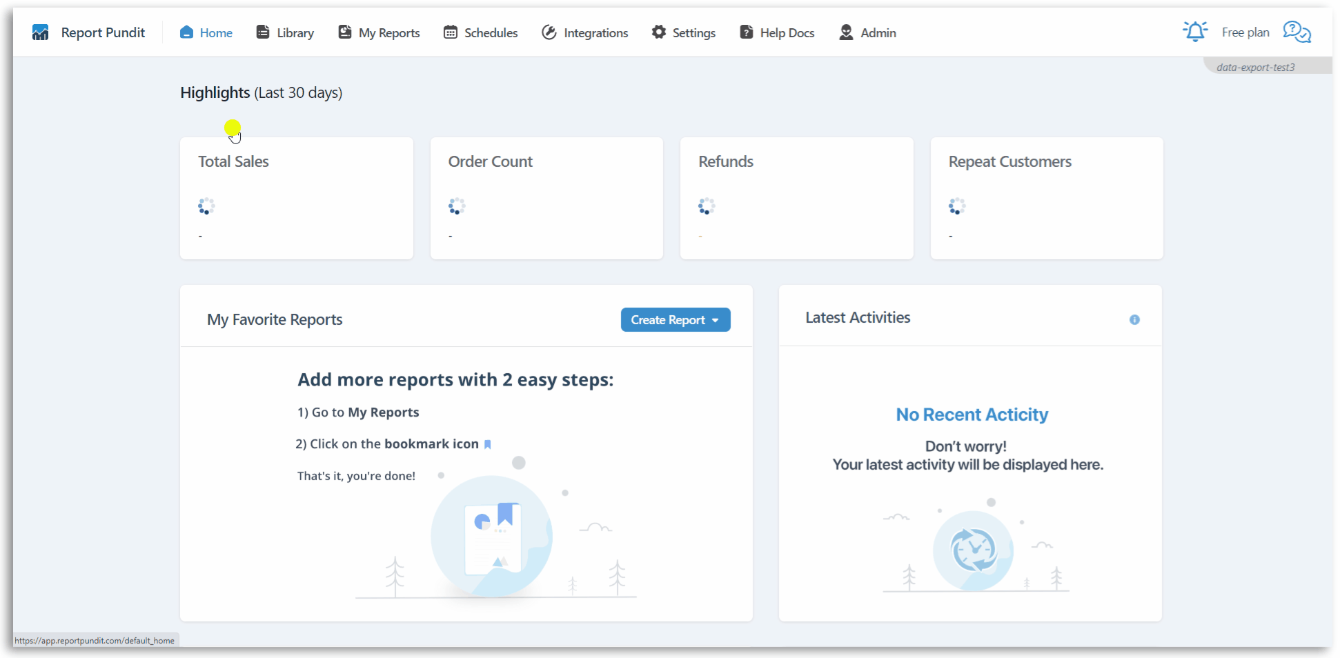 The Home page gives an overview of your account status and activities. You can also see information about integrations and popular reports.